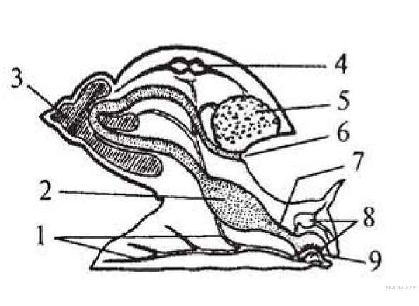 Орган какой системы на схеме строения наземного моллюска обозначен цифрой 1, 8?