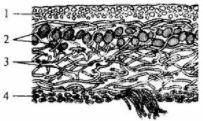 На схеме строения лишайника слой, образованный водорослью или цианобактерией, обозначен цифрой: